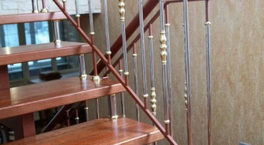- Комбинированные конструкции. Это декоративные перила и ограждения, для изготовления которых используют не только нержавейку, но и другие материалы. Под перилами может быть установлено защитное стекло, а для изготовления поручней может применяться дерево или пластик. Комбинированные модели со стеклянными вставками часто устанавливают на балконах, а с деревом – внутри помещений.