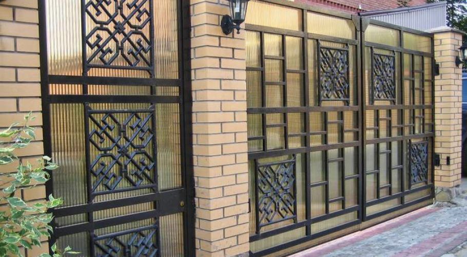 • Модели с разными типами сварных секций для забора. Секционные составляющие могут быть выполнены в виде классической решетки, фигурного ограждения, дополненного элементами машинной ковки. Секции для сварных заборов могут быть прозрачными или глухими. Во втором случае секции и створки ворот будут дополнены разноцветным поликарбонатом.